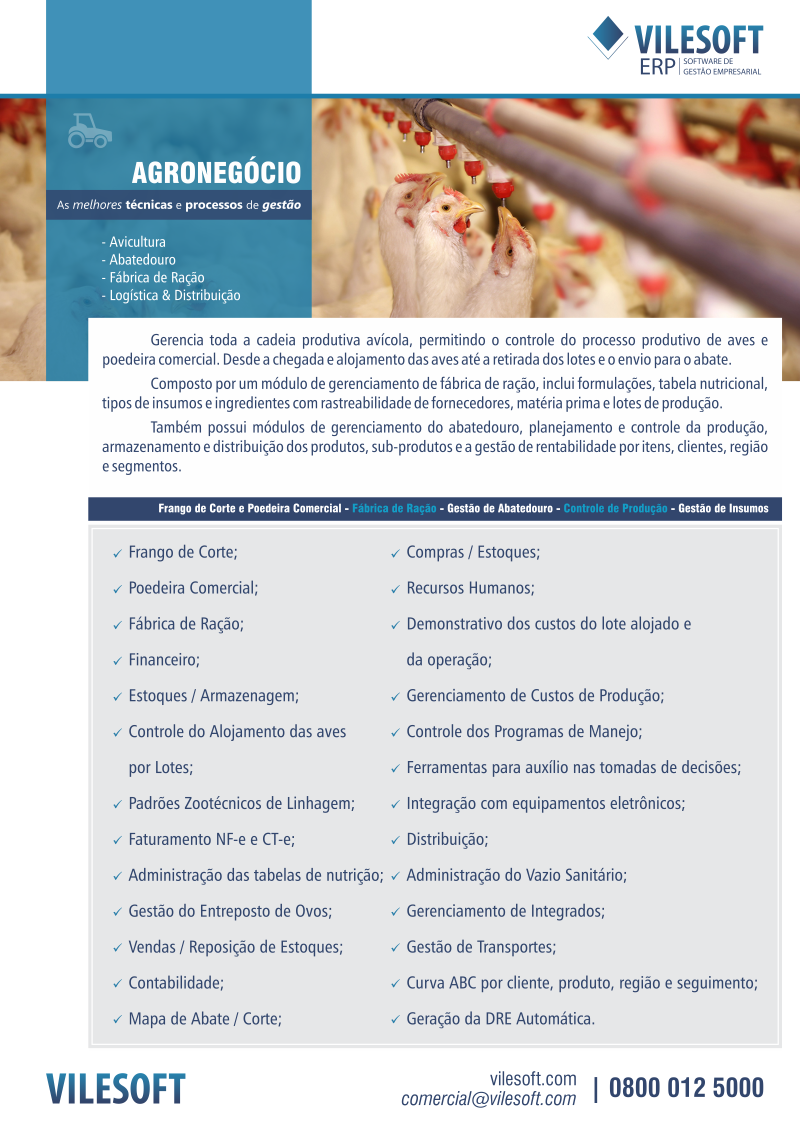 O agronegócio moderno exige agilidade e dados precisos. O software da Vilesoft foi desenvolvido especificamente para o setor de Avicultura e Agronegócio, integrando desde a fábrica de ração até a logística de distribuição.