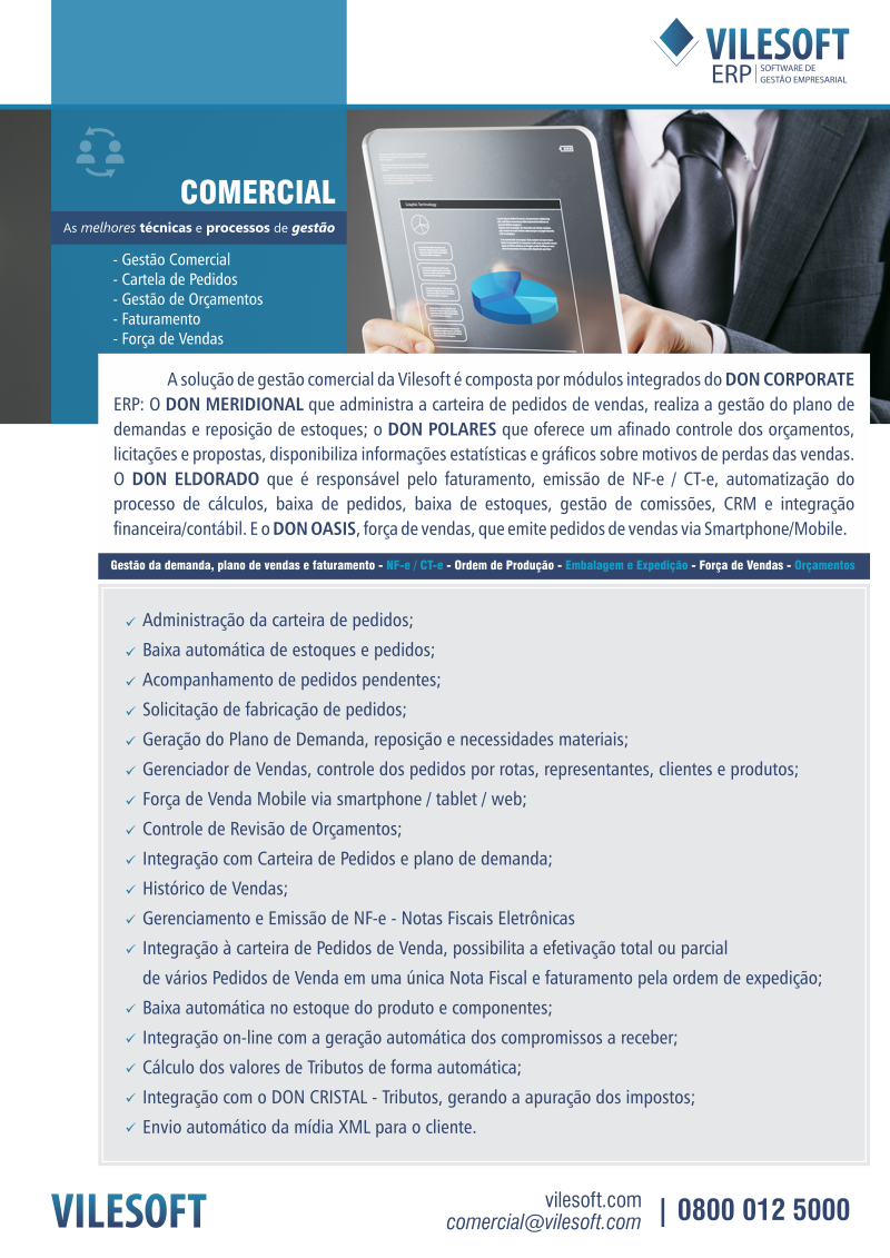 “Mais do que vender, é preciso gerir a entrega e a lucratividade. O ERP Vilesoft oferece a estrutura necessária para o crescimento sustentável da sua força de vendas.”